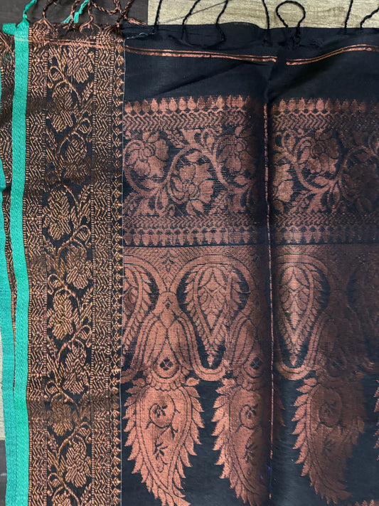 Ganga Yamuna border copper Zari weaved linen Jamdani saree black