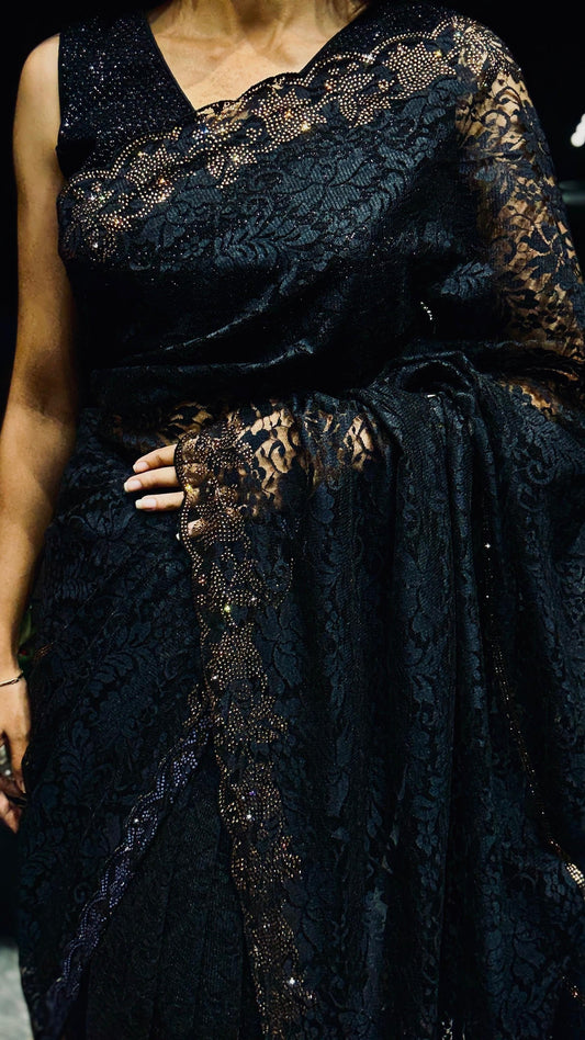 Black Coloured Lace Saree with Scallop Border
