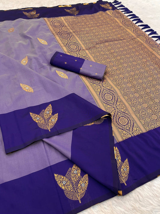 Purple and Teal Banarasi Silk Saree with Gold Zari Leaf Motifs